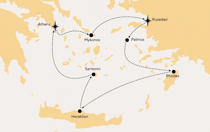 旅のスタートは、古代ギリシャ神話の女神を祀ったパルテノン神殿が輝くギリシャの首都アテネ。アテネの南に位置するラブリオ港から船は出発し、まずは「エーゲ海に浮かぶ白い宝石」と称されるミコノス島へ。そして次に訪れるのは、トルコのクシャダスです。古代ローマの遺跡が残るエフェソスへもすぐ。エクスカーション(別途有料)に参加して世界遺産観光も楽しめます。小さな島パトモスは、聖ヨハネが『黙示録』を書いたとされ、キリスト教徒の篤い信仰を集めています。3日目は終日ロードス島に滞在。「聖ヨハネ騎士団」が築いた城塞が世界遺産に登録された旧市街や、古代ギリシャのアクロポリスの遺跡が残るリンドス村などが見どころです。そして4日目にはギリシャ最大の島、クレタ島を訪れます。ここは古代ミノア文明が栄えた土地で、クノッソス観光がおすすめです。クルーズのハイライトとなるのは、青と白の絶景が広がるサントリーニ島! 崖の上には白い建物が重なるように立ち並び、その中に青いドーム屋根の教会が点在する風景がとてもロマンティックです。サントリーニ島を離れた船は一路、アテネへ戻ります。