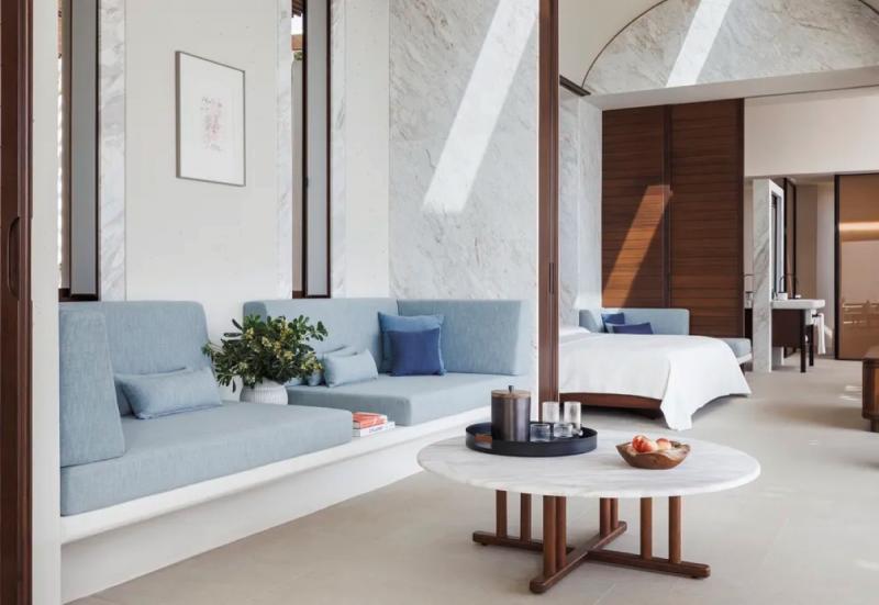 白い壁に涼やかさが感じられると同時に、木質の家具やライニングと上質なファブリックが温かみを感じさせるインテリア。ユニークなアーチ形の天井にしつらえられた天窓からも太陽の光が注ぎ込み、まるで神殿の中にいるかのようです。室内とプール付きのプライベートテラスとがシームレスにつながり、室内外のどこにいても大自然との調和が感じられます。大理石のバスルームには、バスタブとレインフォールシャワーを完備しています。