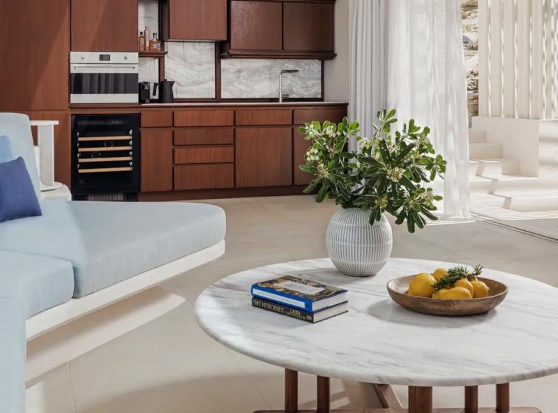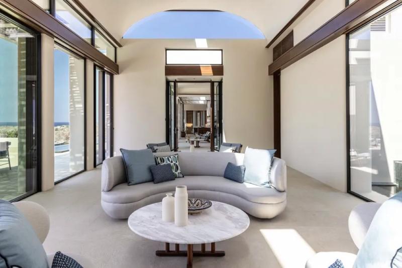 アテネの南東に位置するケア島は、古代遺跡や美しいビーチが点在する手つかずの自然が残る島。この島の西海岸の断崖の上に広大な敷地を持つワン&オンリー ケア アイランドは、その景観を最大限に活かすように設計されています。建築には、白塗りの壁、天井のアーチなどキクラデス諸島に特徴的なモチーフが見られ、大きな窓が光と景色とを室内に取り込みます。