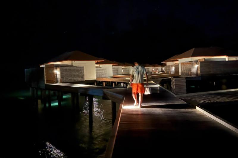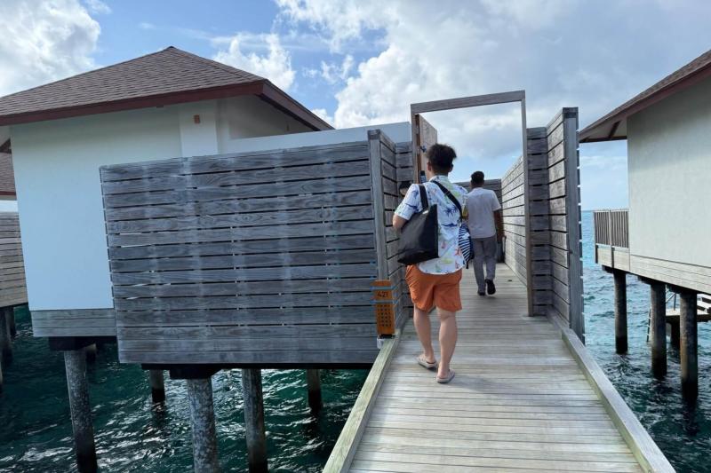 アヴァニに着くと、スタッフたちが笑顔で温かく歓迎してくれました。シャンパンをいただき、ホスト(専属バトラー)からリゾートでのルールを案内されたあと、一番楽しみにしていた水上ヴィラへバギーで移動しました。