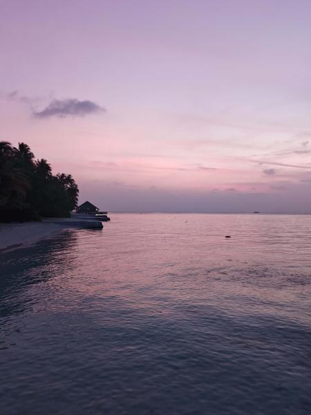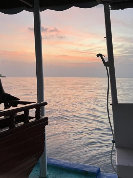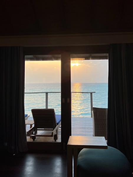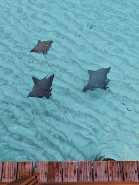 早朝は、部屋の前の海にエイやサメ、カメなどがたくさんいて面白かったです。ヴィラからサンセットも楽しむことができました。