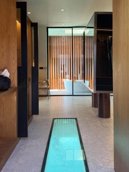 私たちが宿泊した「サンセットオーシャンプールヴィラ」は、最近リニューアルがなされたとてもきれいなお部屋だったので、おしゃれな内装と最新の設備で整っていて大満足でした。海が透けて見える透明な床は、夜に部屋の灯りにつられて魚たちが来てくれる好ポイントです。