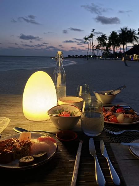 Aやはり、一番はモルディブの美しい景色です。幸運にも一度も雨に降られることなく、信じられないほど美しい海、空、ビーチや自然を全身で感じることができました。日常のどこを切り取っても美しい景色ばかりでした。特に、透き通る海に夕日が沈んでいく様子をヴィラから眺めた光景は、一生忘れられません。
