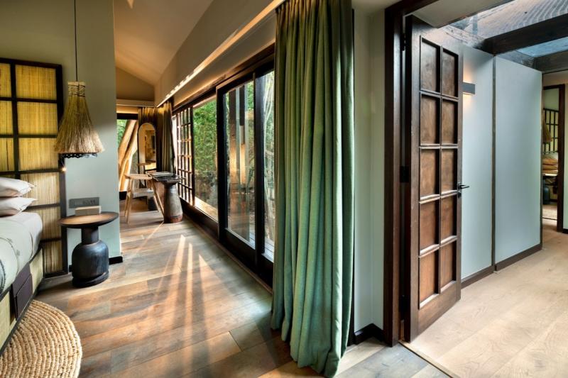 支柱の上に建つスイートは、ゴージャスなツリーハウスのような雰囲気。95㎡の広さがあり、建物を囲むようにデイベッド付きのベランダが設置されています。ベッドルームには3方向の景色を切り取る大きな窓が設けられ、豊かな緑はまるで絵画のよう。広々としたバスルームにも大きな窓があり、森林浴をしながらのバスタイムで癒されます。室内のシャワールームにはデッキに直接出られるドアがあり、開放感あふれる造りです。